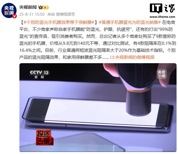 央视曝光个别防蓝光手机膜效果相当于保鲜膜,实际效果与宣传差距较大